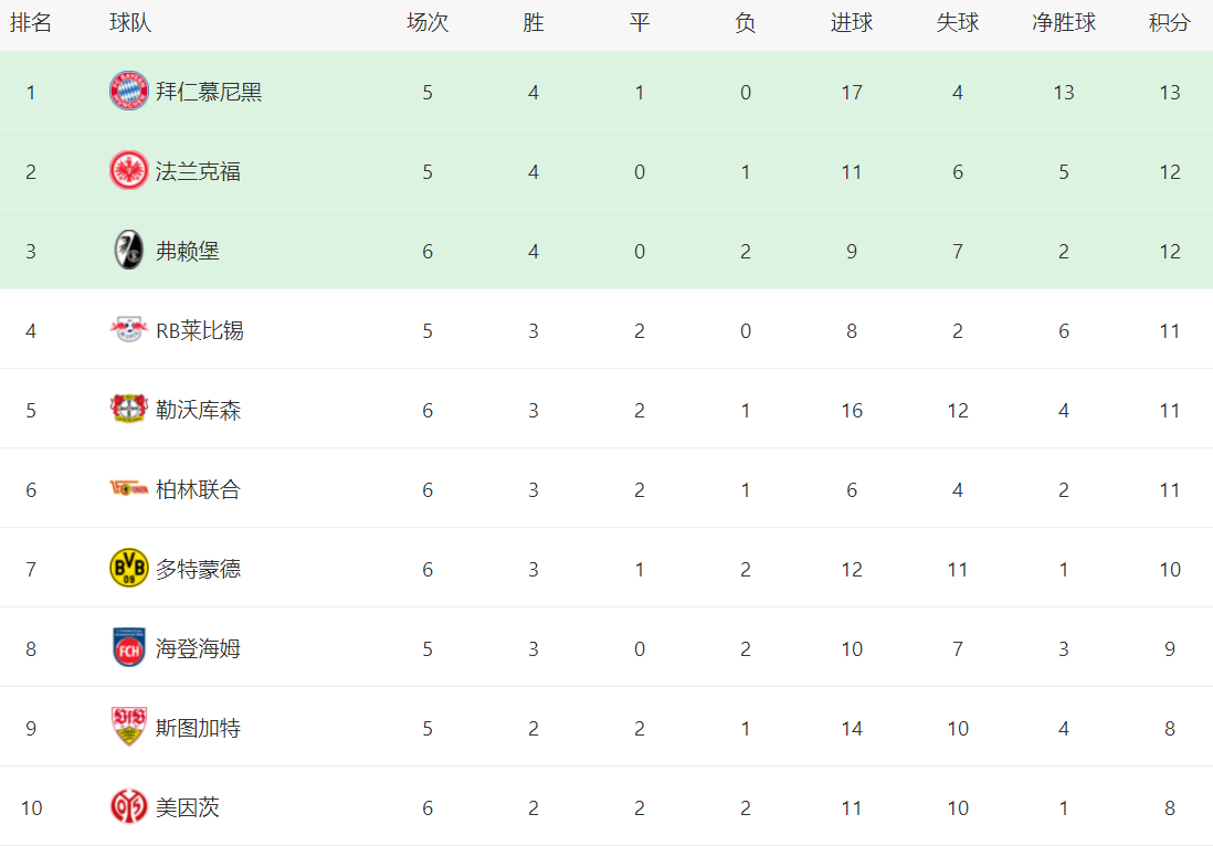 在积分榜上,拜仁以4胜1平13分排名榜首,法兰克福以4胜1负12分排名第二,弗赖堡以12分排名第三,莱比锡以11分排名第四。勒沃库森以11分排名第五,虽然比拜仁少2分,但却比拜仁多踢了1场球赛。勒沃库森在这个赛季的表现相当一般。尽管勒沃库森距离榜首的拜仁只有2分的差距,但他们需要踢更多场比赛才能追上拜仁。对于勒沃库森来说,想要卫冕联赛冠军的难度确实很大。返回搜狐,查看更多