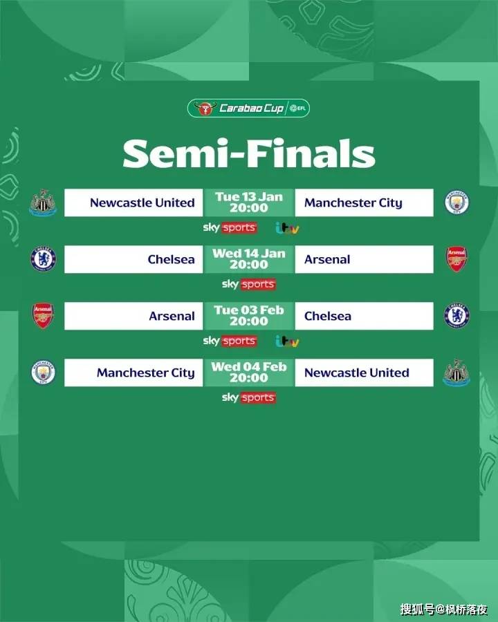 阿森纳晋级联赛杯四强后,将在半决赛对阵切尔西。半决赛采用两回合赛制,首回合将于1月15日在切尔西主场进行,次回合2月4日移师阿森纳主场。