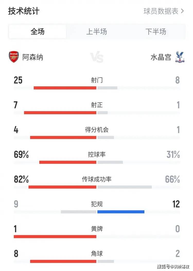比赛的技术统计揭示了阿森纳的统治力与效率困境。阿森纳全场创造4次得分机会,而水晶宫仅有1次。传球成功率方面,阿森纳82%对水晶宫的66%,优势明显。